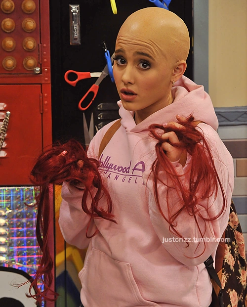 Cat:(walks up to everyone who reacts all shocked and concerned to see her bald, holding pieces of her hair) I fell asleep during Study Hall... Jade found me. (Holds out pieces of her hair) Sikowitz: Aww, don't be sad, little one! I think your head looks great like that! Cat: Of course you do!